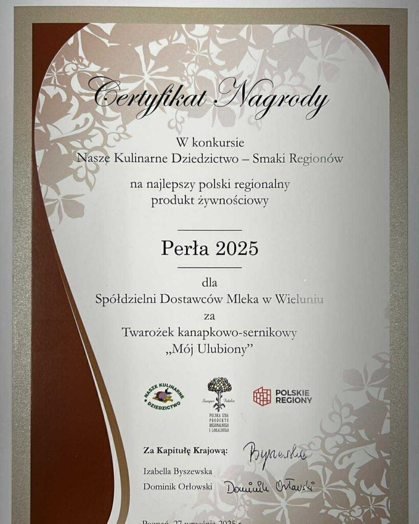 Z ogromną radością informujemy, że Prezes Spółdzielni Dostawców Mleka w Wieluniu Marek Kapica odebrał z rąk Marszałek Województwa Łódzkiego Joanny Skrzydlewskiej dyplom gratulacyjny za dotychczasowe sukcesy SDM Wieluń oraz za zdobycie prestiżowego tytułu „Perła 2025” dla naszych produktów Mój Ulubiony!